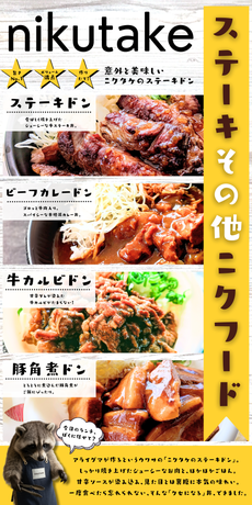 ドン!!とボリュームたっぷり! 丼・弁当とここでしか味わえない一品です!!是非!! 国産牛肉を丁寧に仕上げたステーキドン!! 牛スジを贅沢に使用した絶品のビーフカレーです!! 炭火の香りがしみ込んだ絶品牛カルビドン! 丁寧に炊き込んだ豚角煮ドン!!